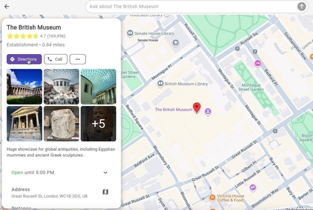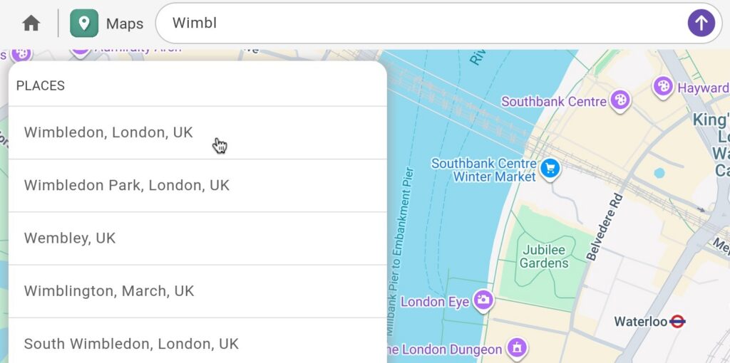 Once a location has been chosen, you can type questions into the text field and receive answers relevant to that location. For example, if the location is “Westminster, London” and you type “Department stores,” you will be shown links to department stores in that area.