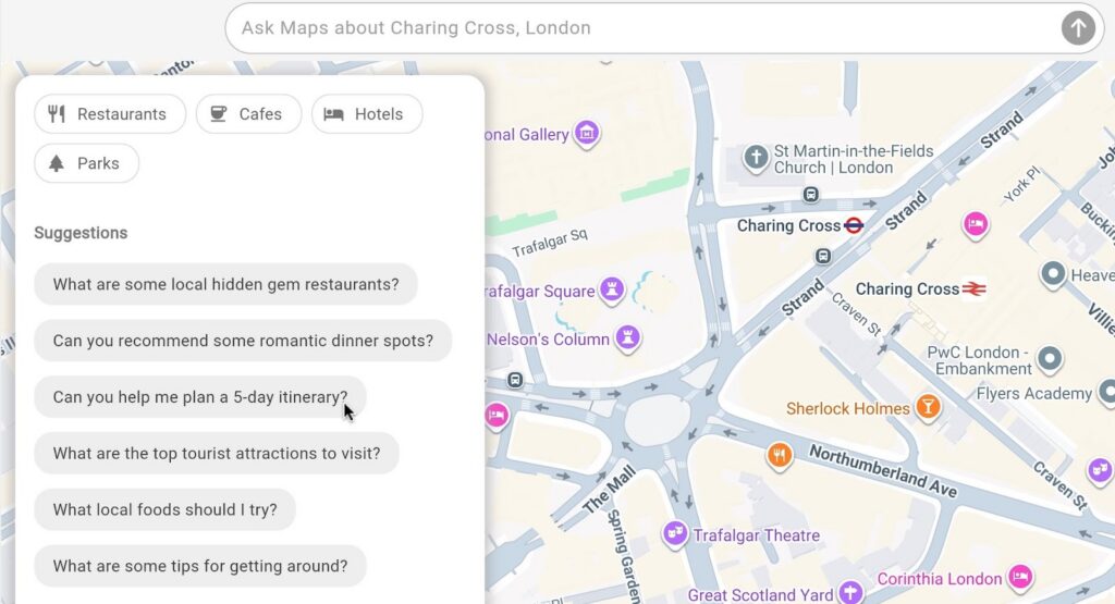 • Click on the category you wish to ask Maps about; either Restaurants, Cafes, Hotels, or Parks