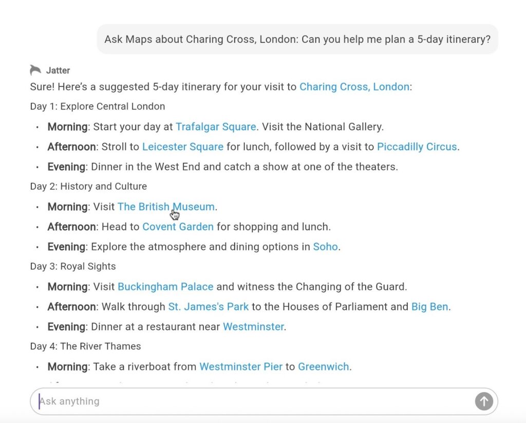 In this example, “Can you help me plan a 5-day itinerary?” resulted in the following answer: